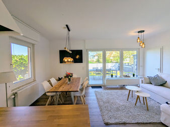 Im Erdgeschoss finden Sie den offenen Wohn-Essbereich mit großer Inselküche, schwenkbarem Smart-TV, einer gemütlichen Wohnlandschaft und dem Zugang zum Abstellraum mit Waschtrockner.