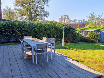 Vom Ess- und Wohnbereich kommen Sie bequem auf die große Terrasse im komplett eingezäunten Garten, auf der bei schönem Wetter bis zu sechs Personen Platz finden.